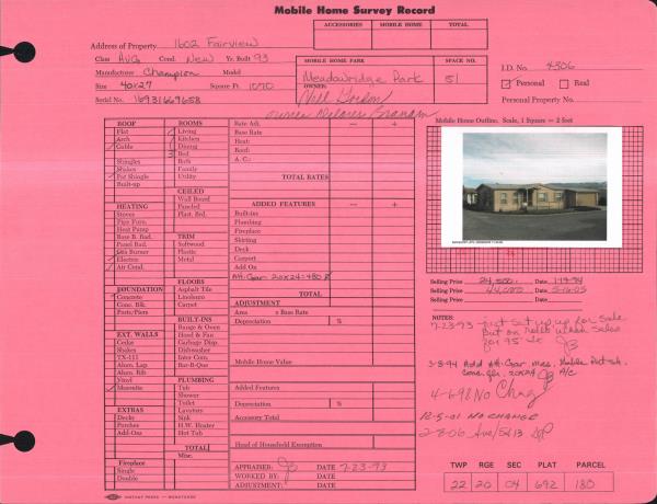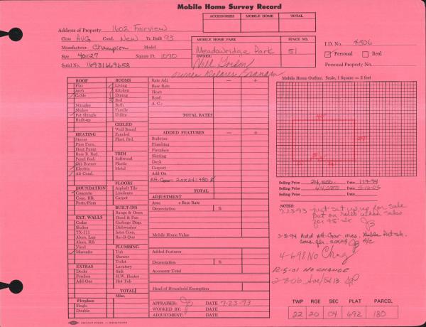 | Property ID: | 12072 | Abbreviated Legal Description: | MEADOW RIDGE MOBILE HOME PARK SPACE 51 93 CHAMPION 40X28 |