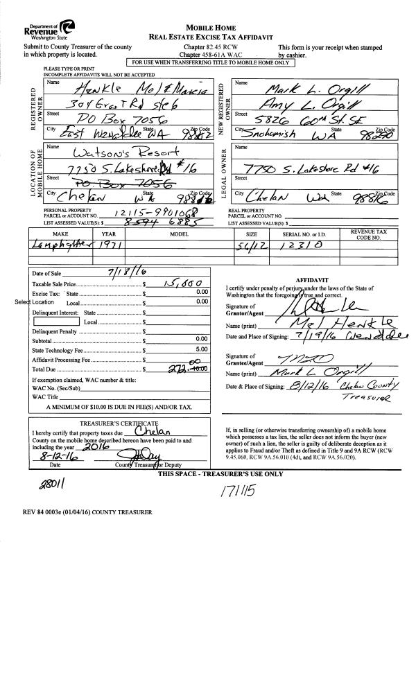 | 1 | 07/26/2016 | MH TITLE | Mobile Home Title | HENKLE MEL R & MARCIA J | ORGILL AMY L & MARK L | | | $15,000.00 | 171115 | |
