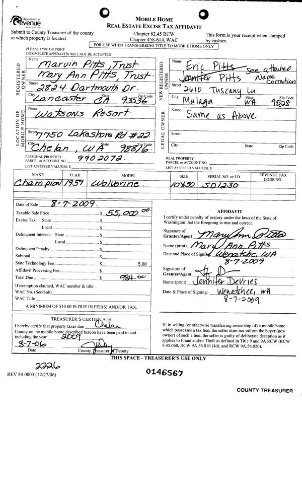 | 2 | 08/07/2009 | MH TITLE | Mobile Home Title | PITTS MARVIN & MARY ANN 2001 TRUST | DEVRIES ERIC & JENNIFER | | | | 0 | |