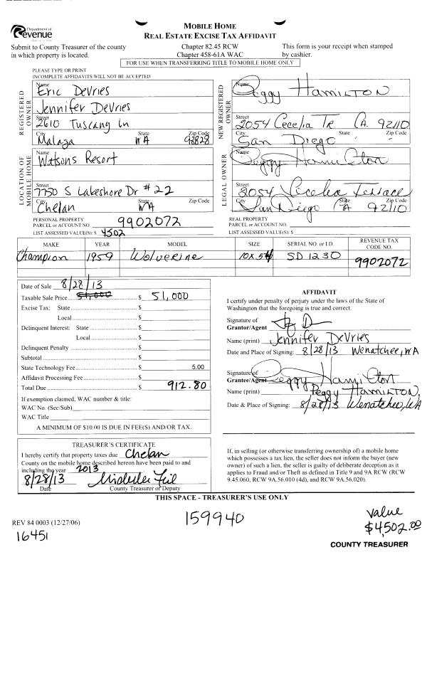 | 1 | 08/28/2013 | MH TITLE | Mobile Home Title | DEVRIES ERIC & JENNIFER | HAMILTON PEGGY | | | $51,000.00 | 159940 | |