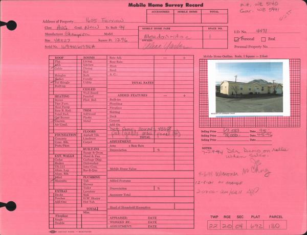 | Property ID: | 12211 | Abbreviated Legal Description: | MEADOW RIDGE MOBILE HOME PARK SPACE 1 94 CHAMPION 48X27 |