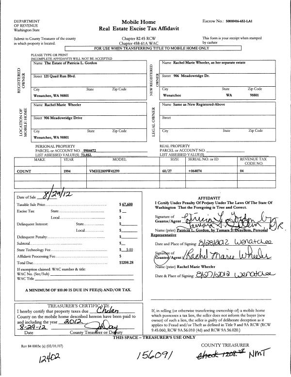 | 2 | 08/29/2012 | MH TITLE | Mobile Home Title | GORDON PATRICIA L | WHEELER RACHEL MARIE | | | $67,600.00 | 156091 | |