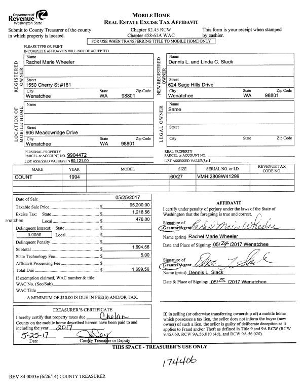 | 1 | 05/25/2017 | MH TITLE | Mobile Home Title | WHEELER RACHEL MARIE | SLACK DENNIS L & LINDA C | | | $95,200.00 | 174406 | |