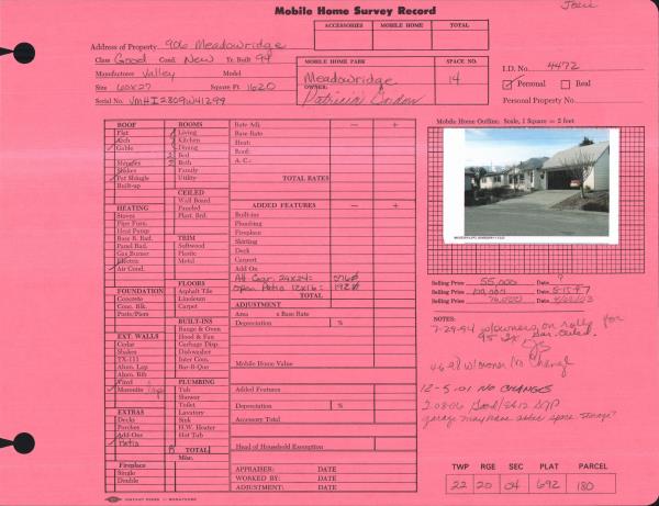 | Property ID: | 12212 | Abbreviated Legal Description: | MEADOW RIDGE MOBILE HOME PARK SPACE 14 94 VALLEY 60X27 |