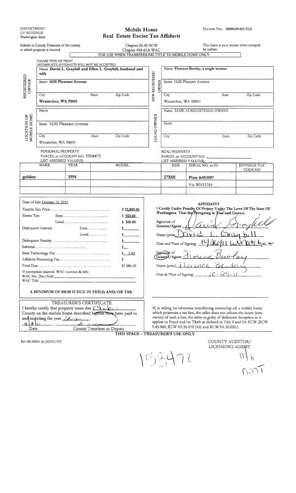 | 4 | 11/08/2011 | MH TITLE | Mobile Home Title | GRAYBILL DAVID L & ELLEN | BEWLAY FLORENCE | | | $72,000.00 | 153478 | |