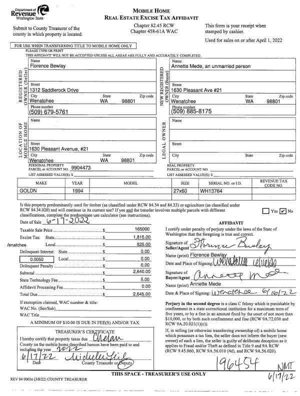 | 3 | 06/17/2022 | MH TITLE | Mobile Home Title | BEWLAY FLORENCE | MEDE ANNETTE L | | | $165,000.00 | 196454 | |
