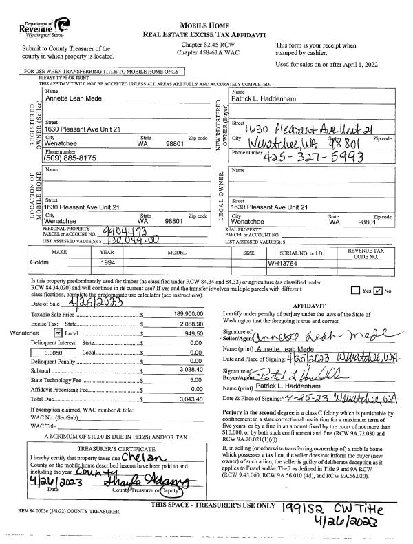 | 2 | 04/26/2023 | MH TITLE | Mobile Home Title | MEDE ANNETTE L | HADDENHAM PATRICK L | | | $189,900.00 | 199152 | |
