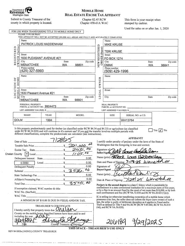 | 1 | 07/28/2025 | MH TITLE | Mobile Home Title | HADDENHAM PATRICK L | KRUSE MICHAEL P & TERI J | | | $221,000.00 | 206189 | |