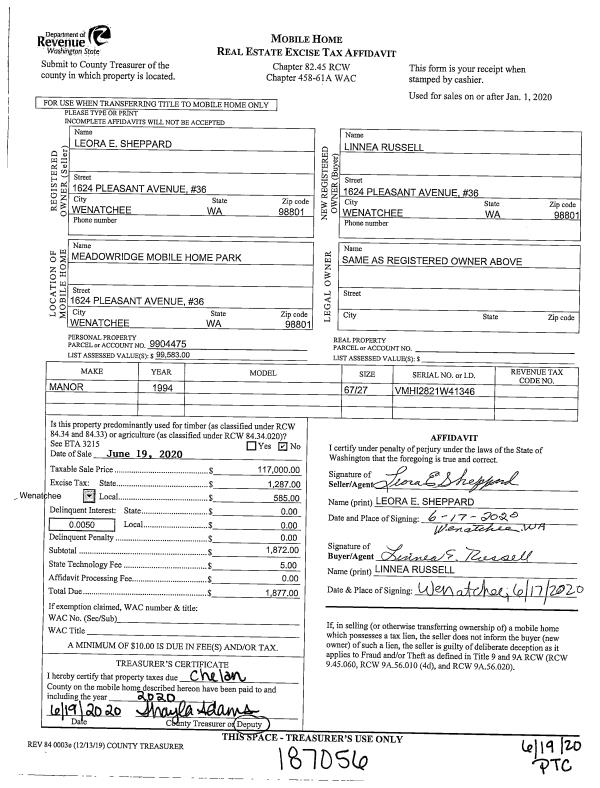 | 2 | 06/19/2020 | MH TITLE | Mobile Home Title | SHEPPARD LEORA | RUSSELL LINNEA | | | $117,000.00 | 187056 | |