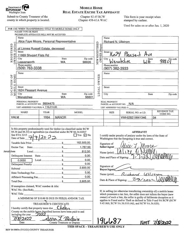 | 1 | 07/07/2022 | MH TITLE | Mobile Home Title | RUSSELL LINNEA | ULLSTROM RICHARD N | | | $162,500.00 | 196687 | |