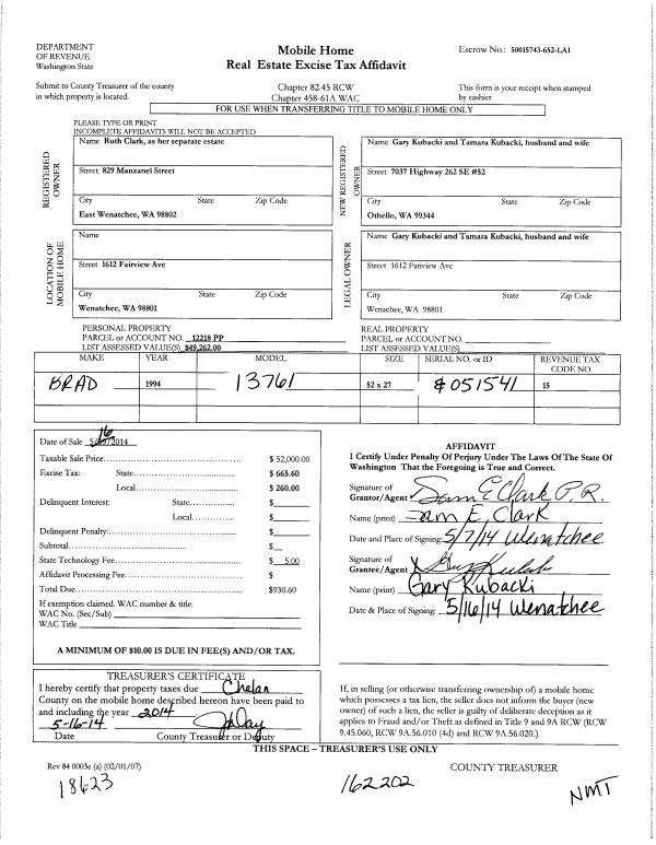 | 1 | 05/09/2014 | MH TITLE | Mobile Home Title | CLARK RUTH | KUBACKI GARY & TAMARA | | | $52,000.00 | 162202 | |