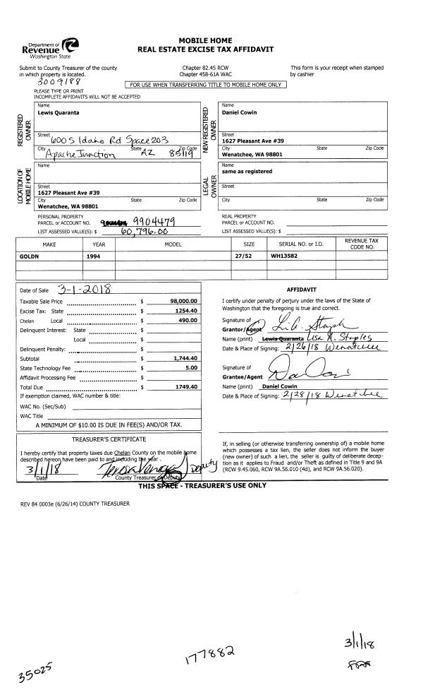 | Mailing Address: | 1627 PLEASANT AVE #39 WENATCHEE, WA 98801 | % Ownership: | % |