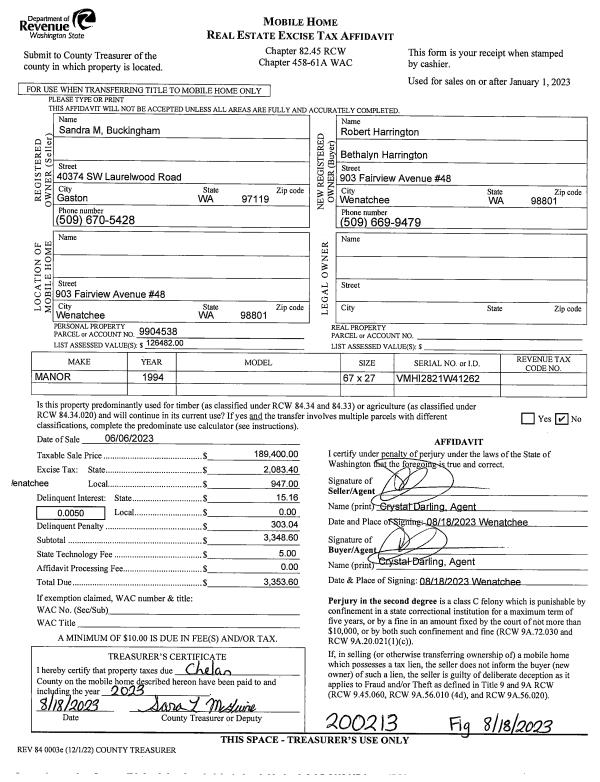 | 3 | 06/06/2023 | MH TITLE | Mobile Home Title | BUCKINGHAM SANDRA M | HARRINGTON ROBERT W & BETHALYNE E | | | $189,400.00 | 200213 | |