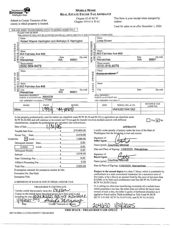 | 2 | 01/31/2025 | MH TITLE | Mobile Home Title | HARRINGTON ROBERT W & BETHALYNE E | BROWN LINDA S | | | $219,900.00 | 204630 | |