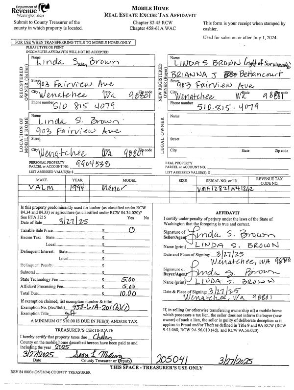 | 1 | 03/27/2025 | MH TITLE | Mobile Home Title | BROWN LINDA S | BROWN LINDA S & BETANCOURT BRIANNA J | | | $0.00 | 205041 | |