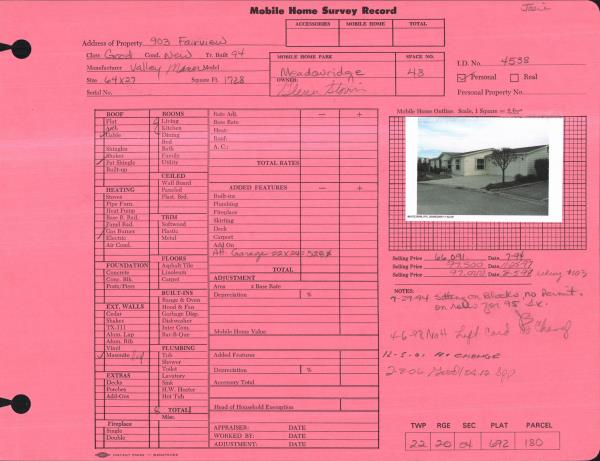 | Property ID: | 12227 | Abbreviated Legal Description: | MEADOW RIDGE MOBILE HOME PARK SPACE 48 94 VALLEY MANOR 64X27 |
