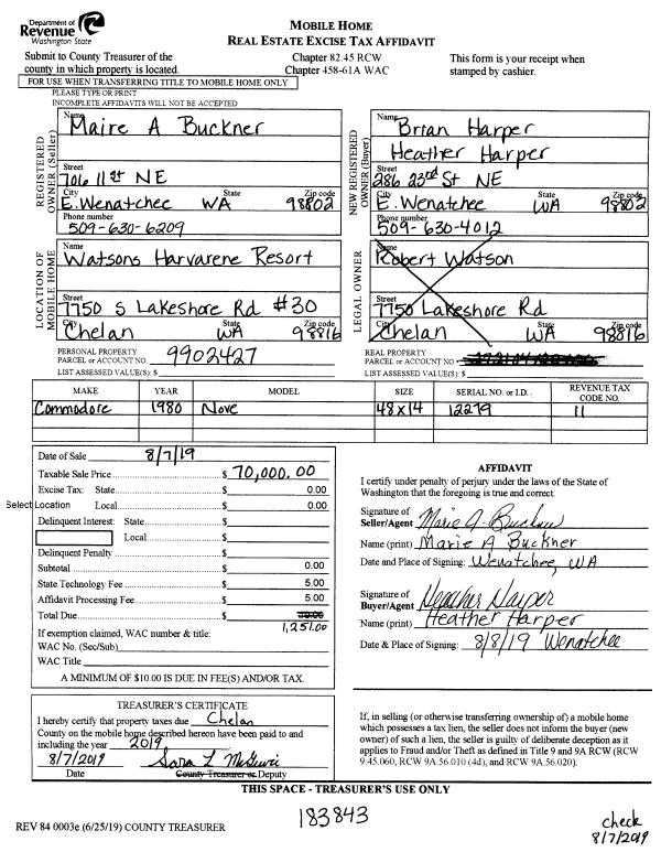 | 1 | 08/07/2019 | MH TITLE | Mobile Home Title | BUCKNER MAIRE A | HARPER BRIAN & HEATHER | | | $70,000.00 | 183843 | |