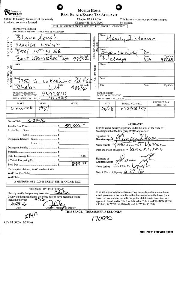 | 1 | 06/29/2016 | MH TITLE | Mobile Home Title | LOUGH SHAUN A & MONICA D | MUSSON MARILYN J | | | $50,000.00 | 170530 | |