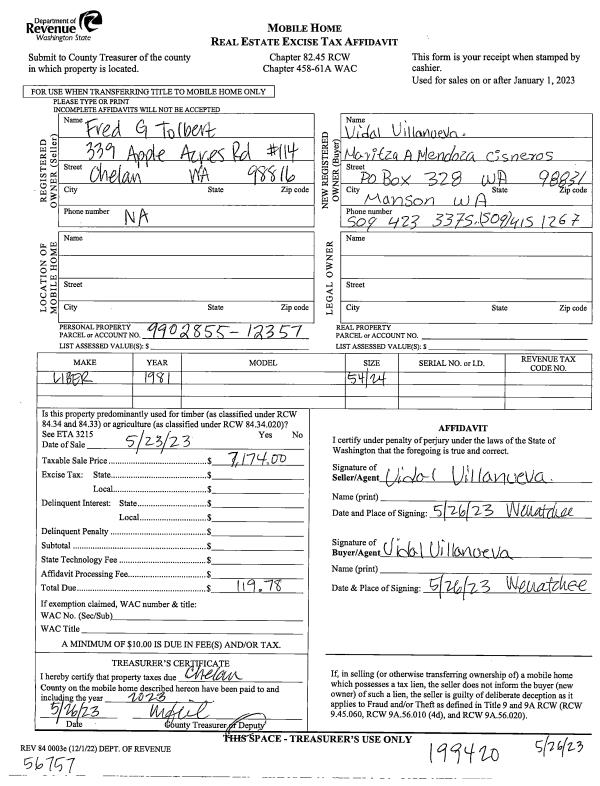 | 1 | 05/23/2023 | MH TITLE | Mobile Home Title | TOLBERT FRED G | VILLANUEVA VIDAL & MENDOZA MARITZA A | | | $7,174.00 | 199420 | |