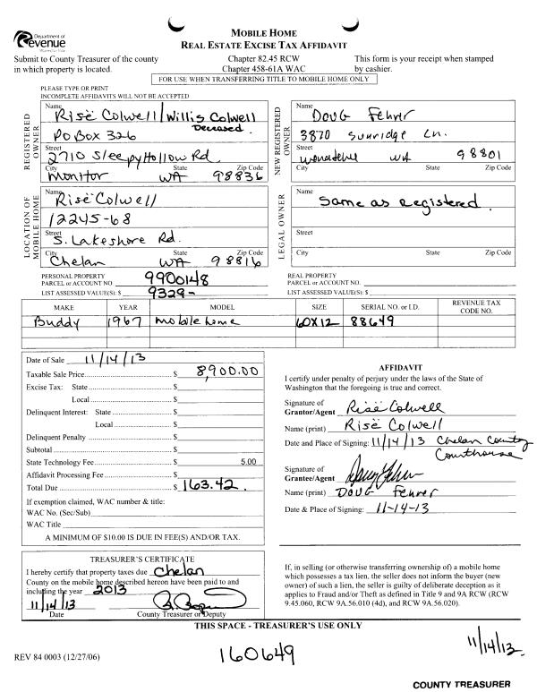 | 3 | 11/14/2013 | MH TITLE | Mobile Home Title | COLWELL WILLIS L & RISE | FEHRER DOUGLAS | | | $8,900.00 | 160649 | |