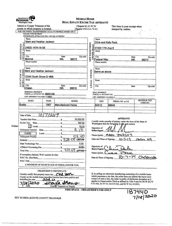 | 1 | 10/07/2019 | MH TITLE | Mobile Home Title | JACKSON MARK & HEATHER | PECK PAUL C & KELLY S | | | $15,000.00 | 187440 | |