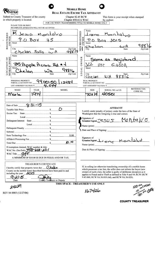 | 1 | 08/31/2015 | MH TITLE | Mobile Home Title | MONTALVO JESUS CURIEL | MONTALVO IRENE A | | | $0.00 | 167426 | |