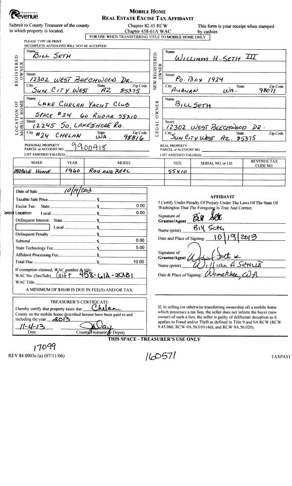 | 1 | 10/19/2013 | MH TITLE | Mobile Home Title | SETH BILL | SETH WILLIAM H III | | | $0.00 | 160571 | |