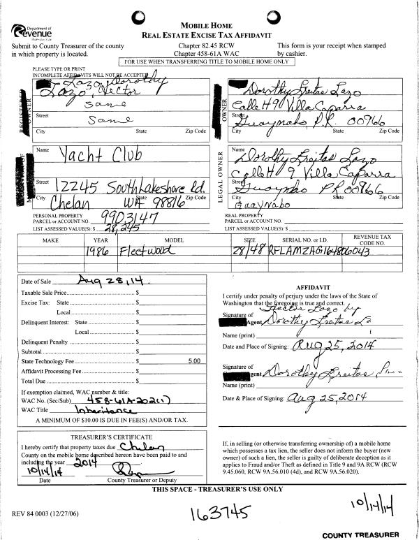 | 2 | 10/14/2014 | MH TITLE | Mobile Home Title | LAZO HECTOR | FREITAS LAZO DOROTHY E | | | $0.00 | 163745 | |