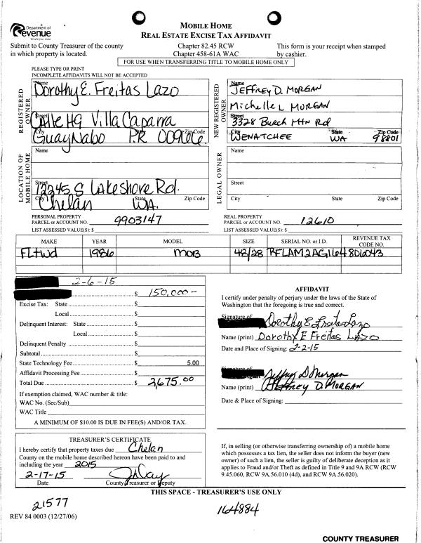 | 1 | 02/06/2015 | MH TITLE | Mobile Home Title | FREITAS LAZO DOROTHY E | MORGAN JEFF & MICHELLE | | | $150,000.00 | 164884 | |
