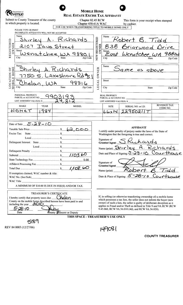 | 5 | 05/28/2010 | AFF | Affidavit | RICHARDS SHIRLEY A | TIDD ROBERT B | | | $62,000.00 | 149081 | |