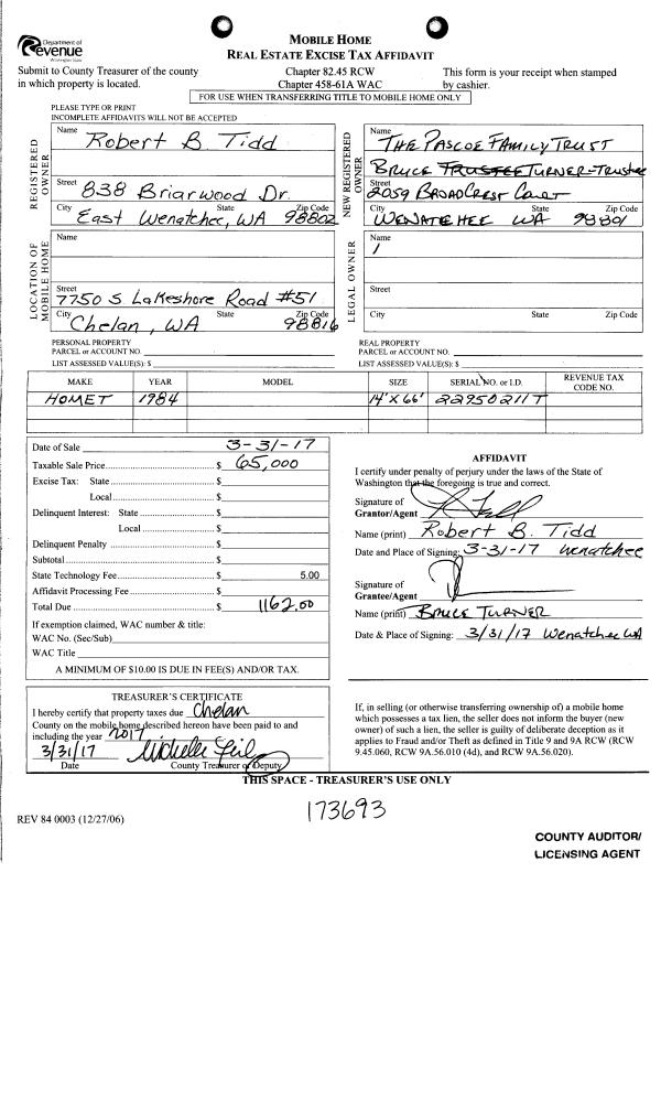 | 3 | 03/31/2017 | MH TITLE | Mobile Home Title | TIDD ROBERT B | PASCOE FAMILY TRUST | | | $65,000.00 | 173693 | |