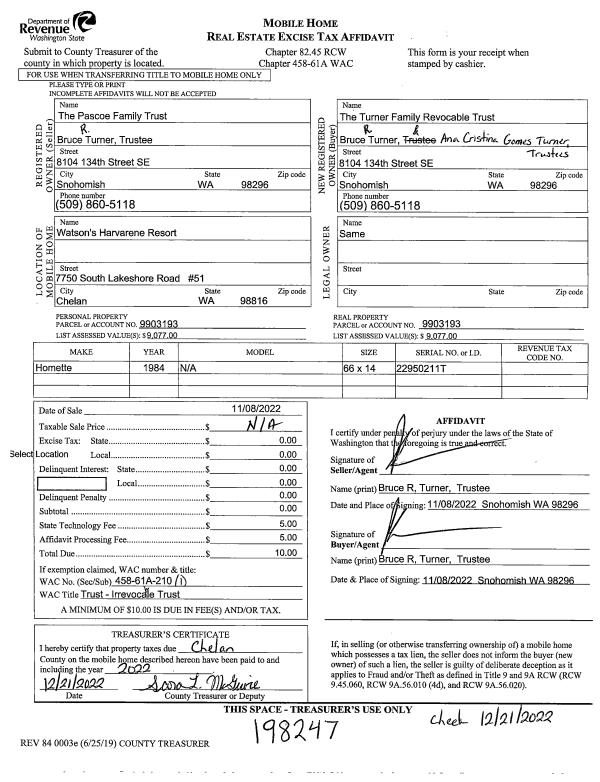 | 2 | 11/08/2022 | MH TITLE | Mobile Home Title | PASCOE FAMILY TRUST | TURNER FAMILY REV TRT | | | $0.00 | 198247 | |