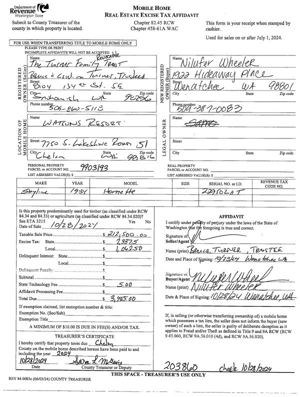 | 1 | 10/28/2024 | MH TITLE | Mobile Home Title | TURNER FAMILY REV TRT | WHEELER NILUFER | | | $212,500.00 | 203860 | |