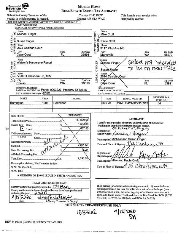 | 2 | 09/15/2020 | MH TITLE | Mobile Home Title | FINGER MICHAEL V | CROFT MIKE S & KACIE A | | | $117,500.00 | 188362 | |
