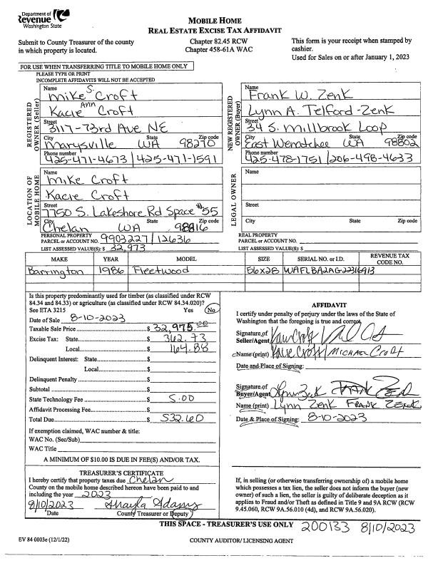 | 1 | 08/10/2023 | MH TITLE | Mobile Home Title | CROFT MIKE S & KACIE A | ZENK FRANK W & LYNN A | | | $32,975.00 | 200133 | |