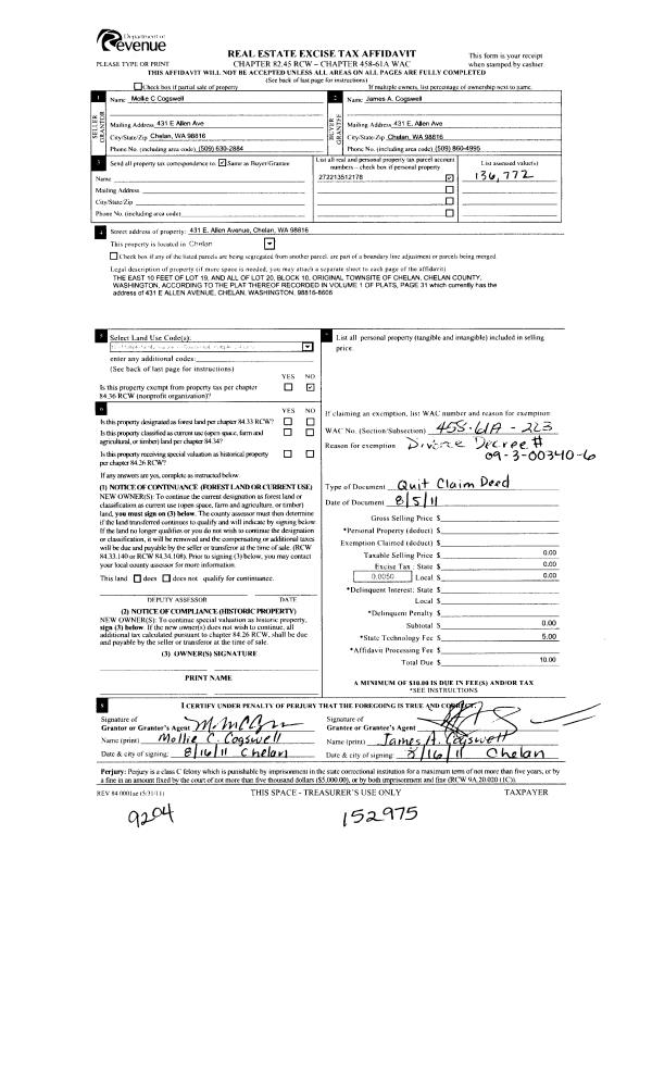 | Mailing Address: | 339 APPLE ACRES RD UNIT 67 CHELAN, WA 98816 | % Ownership: | % |