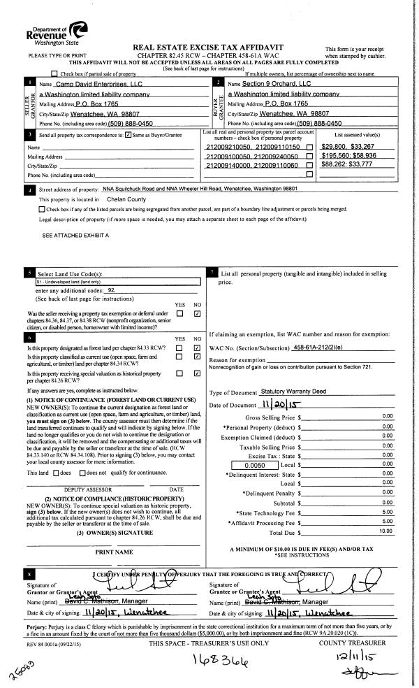 | 2 | 12/11/2015 | SWD | Statutory Warranty Deed | CAMP DAVID ENTERPRISES | SECTION 9 ORCHARD LLC | | | $0.00 | 168366 | 2429600 |