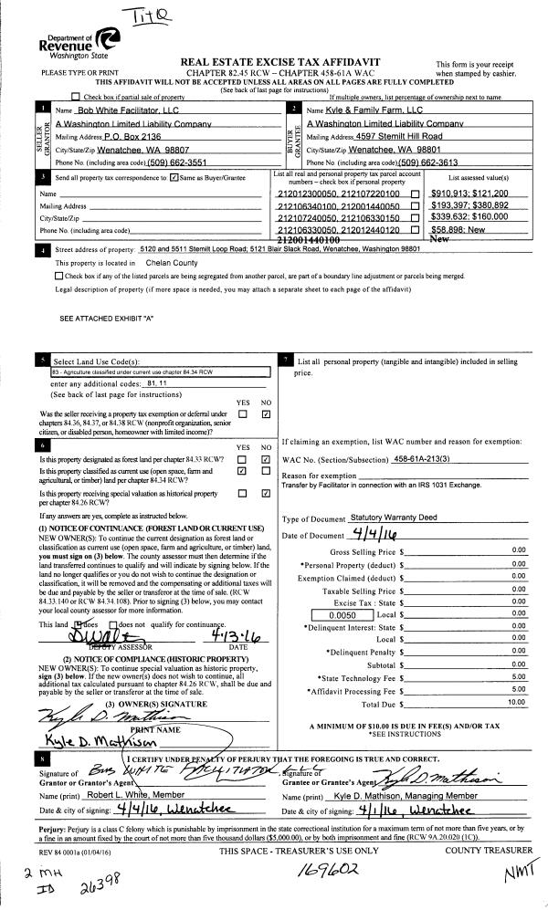 | 2 | 04/13/2016 | SWD | Statutory Warranty Deed | BOB WHITE FACILITATOR LLC | KYLE & FAMILY FARM LLC | | | $0.00 | 169602 | 2435189 |