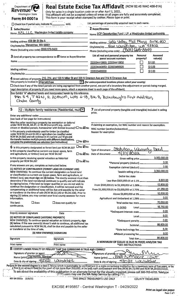1 | 04/29/2022 | SWD | Statutory Warranty Deed | H P L LLC | ECP OPPORTUNITIES FUND I LP | | | $3,350,000.00 | 195857 | 2566319 |