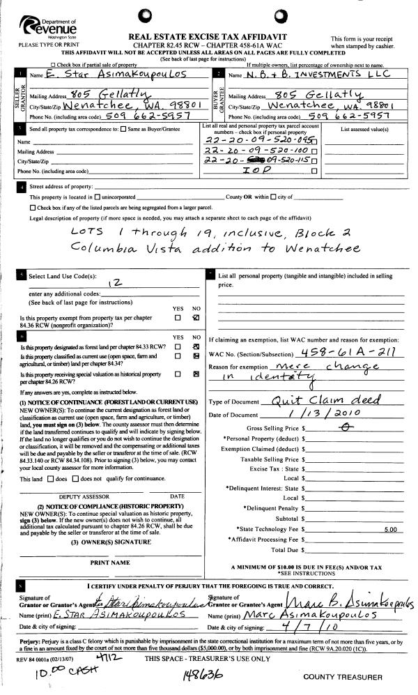 | 2 | 04/07/2010 | Q | Quit Claim Deed | ASIMALOUPOULOS E STAR | N B & B INVESTMENTS LLC | | | | 148636 | 2321583 |