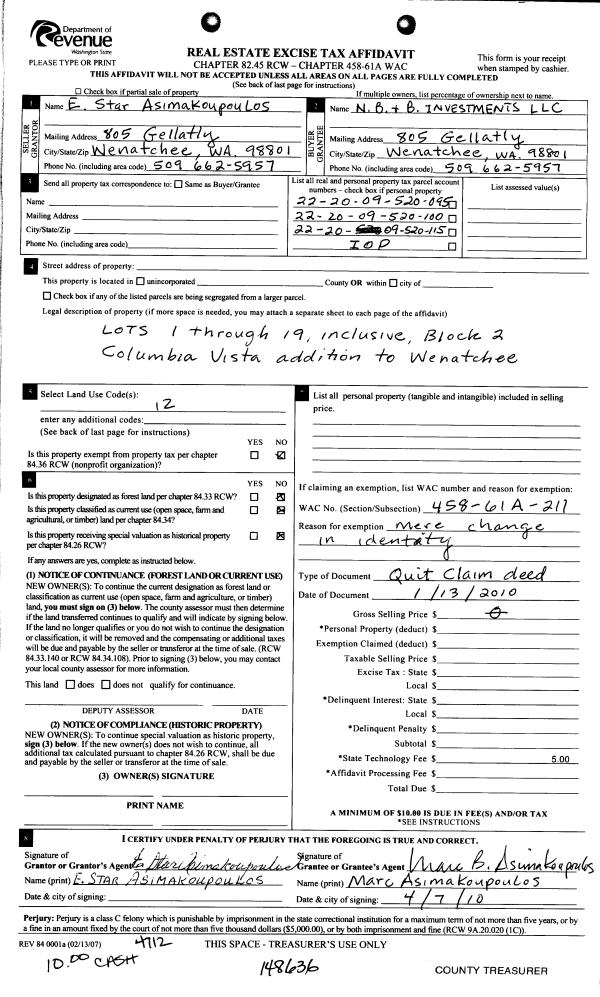| 2 | 04/07/2010 | Q | Quit Claim Deed | ASIMALOUPOULOS E STAR | N B & B INVESTMENTS LLC | | | | 148636 | 2321583 |