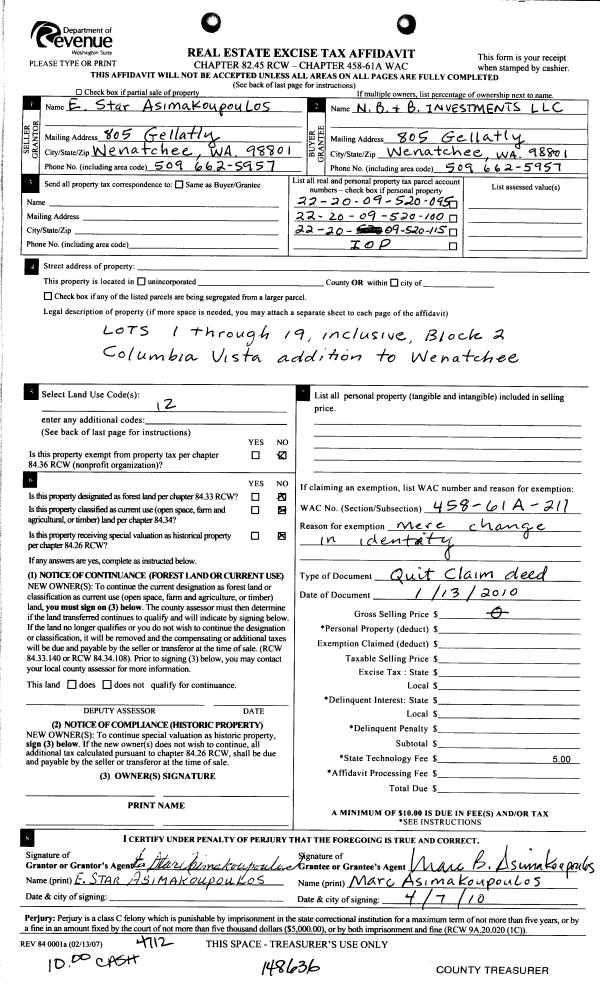 | 2 | 04/07/2010 | Q | Quit Claim Deed | ASIMALOUPOULOS E STAR | N B & B INVESTMENTS LLC | | | | 148636 | 2321583 |