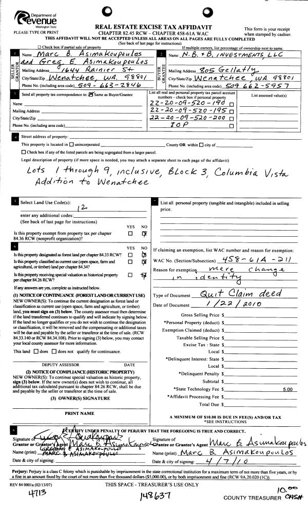 | 5 | 04/07/2010 | Q | Quit Claim Deed | ASIMAKOUPULOS GREGORY E & MARC B | N B & B INVESTMENTS LLC | | | | 148637 | 2321584 |