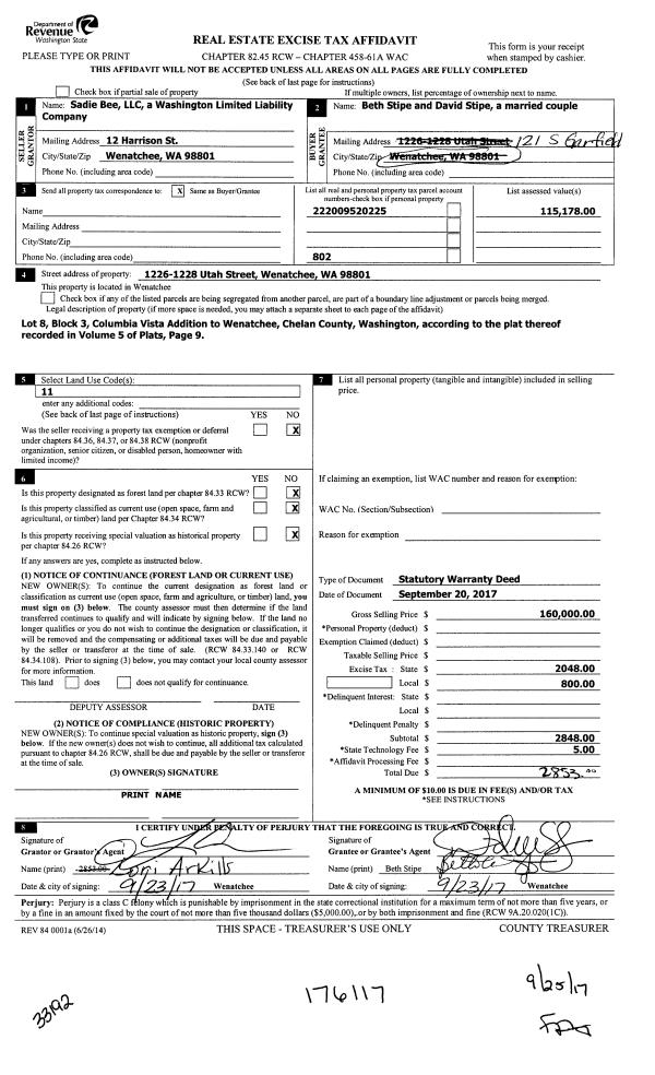 | 2 | 09/22/2017 | SWD | Statutory Warranty Deed | SADIE BEE LLC | STIPE BETH A & DAVID L | | | $160,000.00 | 176117 | 2465615 |