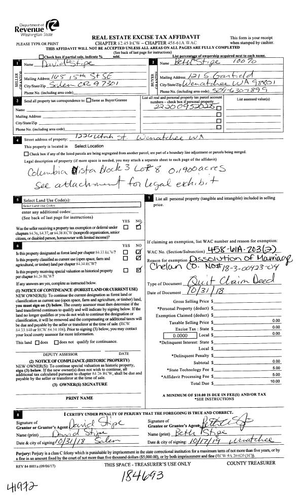 | 1 | 10/17/2019 | Q | Quit Claim Deed | STIPE BETH A & DAVID L | STIPE BETH A | | | $0.00 | 184693 | 2504558 |