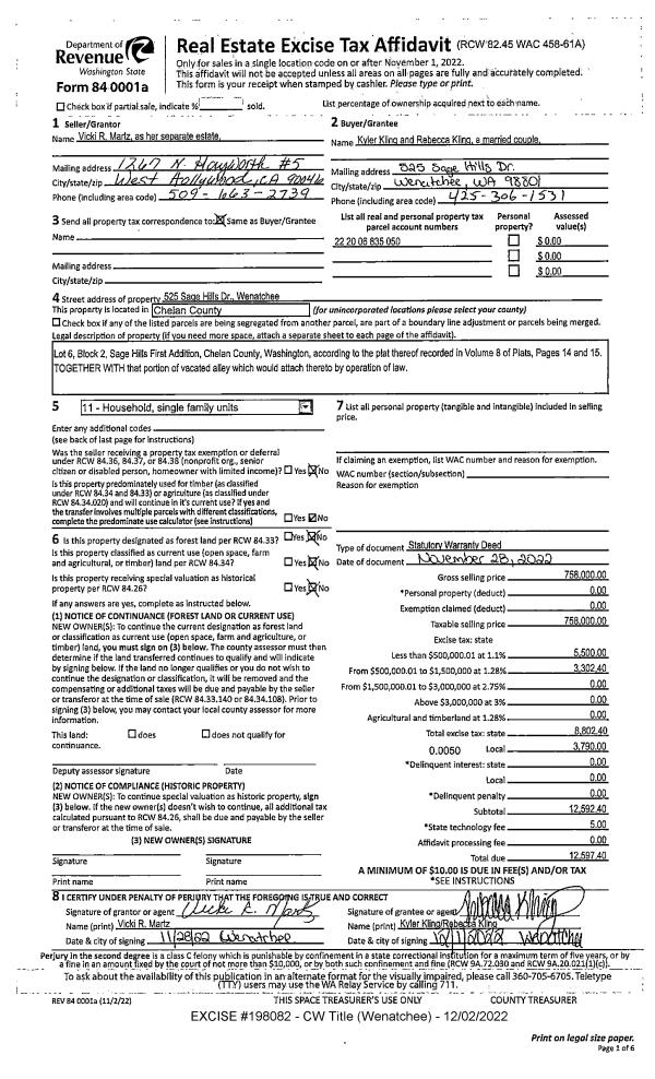 | 1 | 12/02/2022 | SWD | Statutory Warranty Deed | MARTZ VICKI W | KLING KYLER & REBECCA | | | $758,000.00 | 198082 | 2576408 |