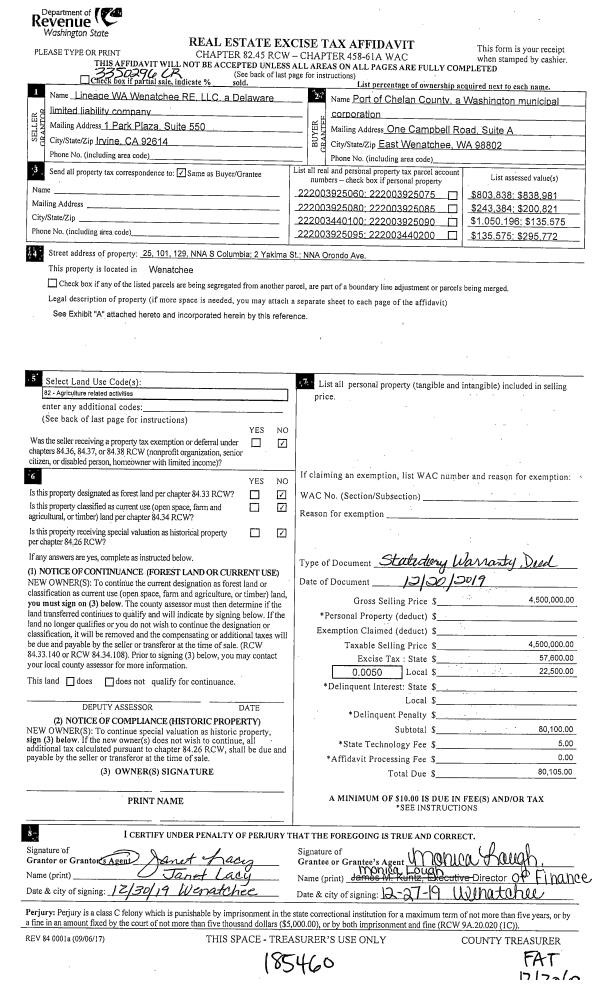 | 1 | 12/30/2019 | SWD | Statutory Warranty Deed | LINEAGE WA WENATCHEE RE LLC | PORT OF CHELAN COUNTY | | | $4,500,000.00 | 185460 | 2508622 |