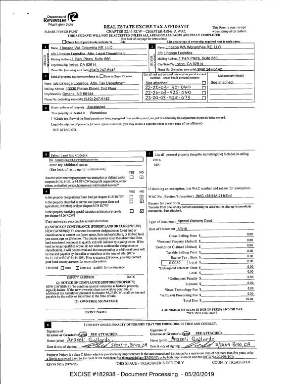 | 2 | 05/20/2019 | SP WD | Special Warranty Deed | LINEAGE WA COLUMBIA RE LLC | LINEAGE WA WENATCHEE RE LLC | | | $0.00 | 182938 | 2496247 |