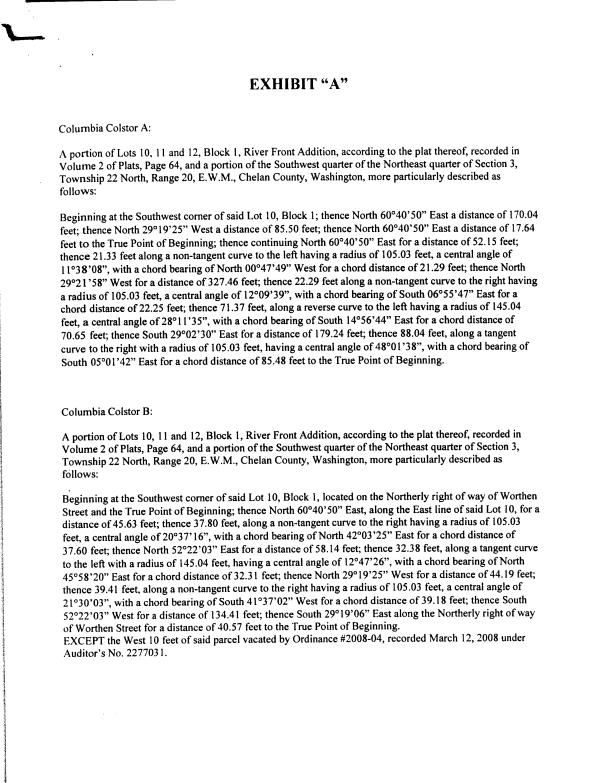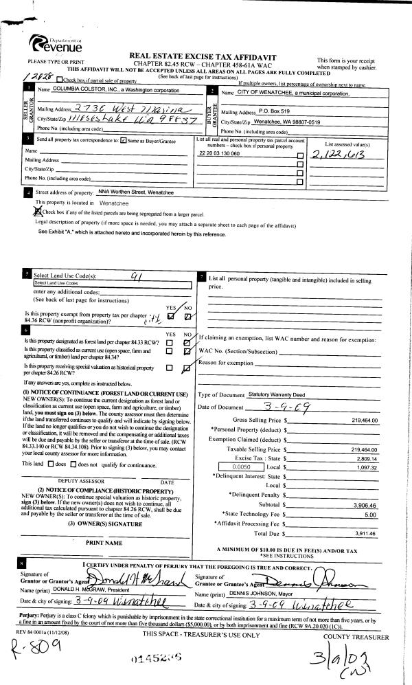 | 10 | 03/09/2009 | SWD | Statutory Warranty Deed | CITY OF WENATCHEE | COLUMBIA COLSTOR INC | | | | 145235 | 2298740 |