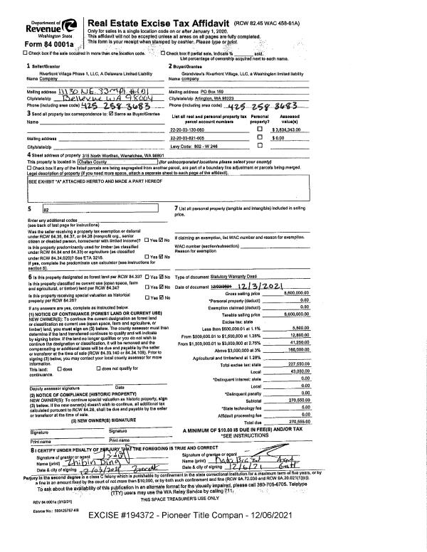 | 3 | 12/06/2021 | SWD | Statutory Warranty Deed | RIVERFRONT VILLAGE PHASE 1 LLC | GRANDVIEWS RIVERFRONT VILLAGE LLC | | | $8,600,000.00 | 194372 | 2558132 |